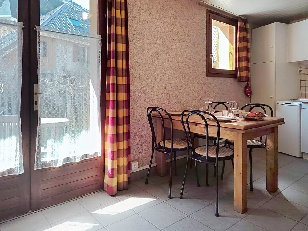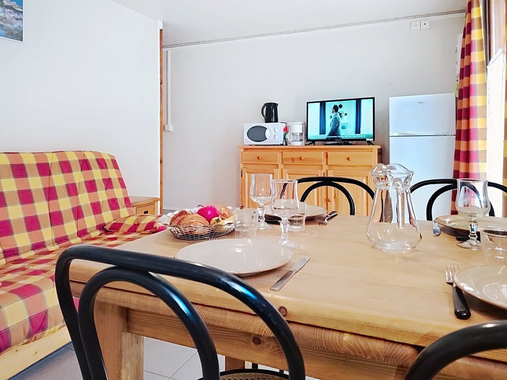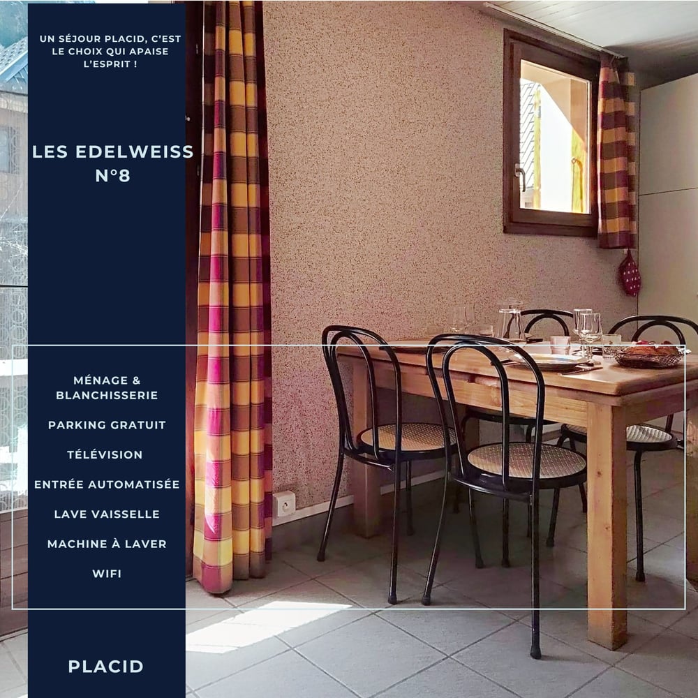Appartement de 45 m2 pour 4 personnes, situé au premier étage de la résidence Edelweiss. Exposition plein sud avec balcon donnant une belle vue sur les montagnes. Il est équipée tout confort : four, micro-ondes, plaques de cuisson vitrocéramique 4 foyers, cafetière classique à filtre, réfrigérateur-congélateur combiné, lave-vaisselle, lave-linge, télévision, internet wifi. Comprend deux chambres avec deux lits simples. Une salle de bain avec douche et WC. Le linge de lit et le linge de toilette sont fournis. Les lits sont faits à votre arrivée. Le ménage de fin de séjour est compris (hors coin cuisine). Il sera toutefois demandé au voyageur de remettre en ordre le logement : balayer le sol, nettoyer la cuisine, vider le frigo et le lave-vaisselle, faire et ranger la vaisselle, vider les poubelles et défaire les lits.